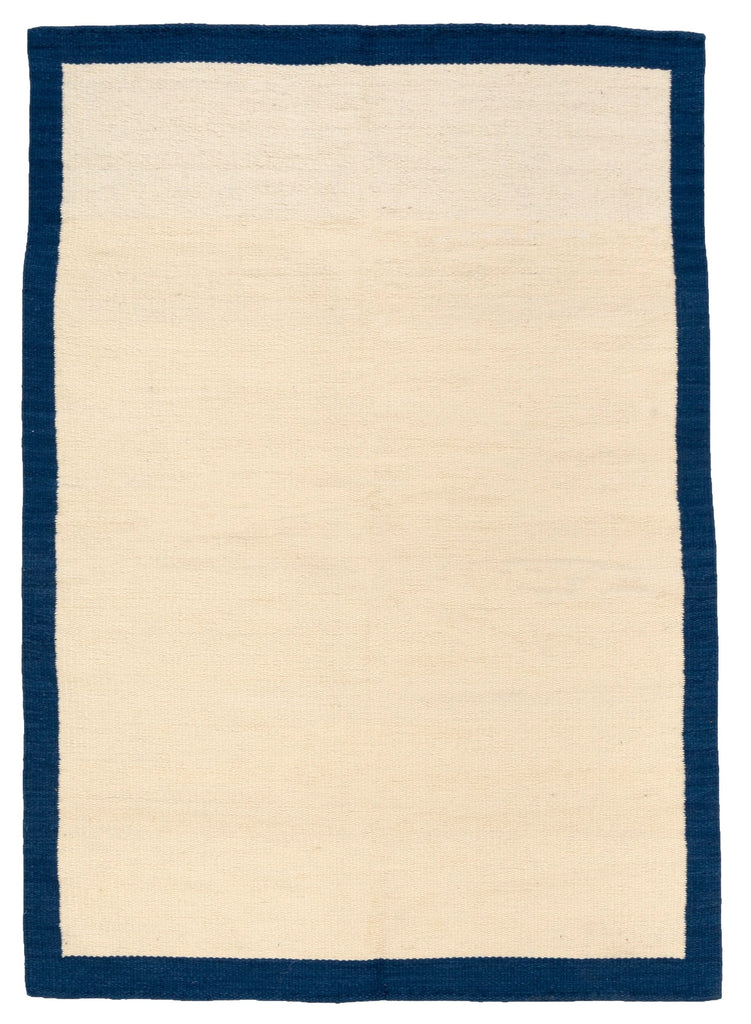 The Alexandra Rug from The Linear Collection features a modern design in Natural tones, highlighted by a Sea Blue banner. This contemporary rug combines clean lines and bold colour contrasts to create a refined look